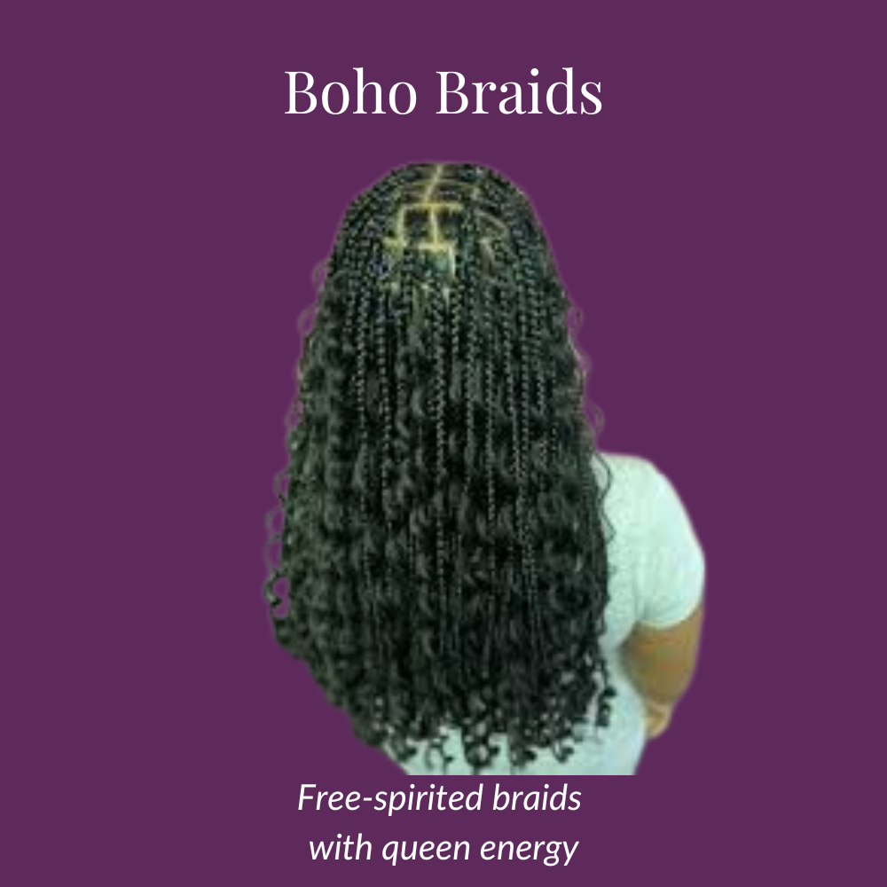 Our Boho Knotless Braids blend the sleek look of knotless braiding with the soft, curly, undone finish of bohemian style. Designed for the carefree queen who loves movement, texture, and a little extra glam.